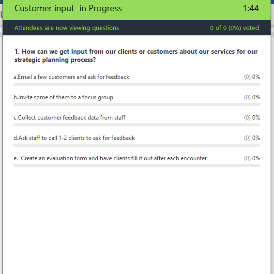 - Use a poll (on Zoom or another platform) and ask people to weigh in. For example, How can we get input from our clients or customers about our services for our strategic planning process?
