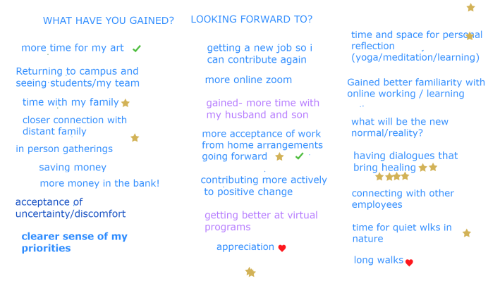 I’ve facilitated several conversations to help clients who were feeling isolated and at loose ends to feel connected and supported. As a coach and facilitator, I do a lot of listening and creating opportunities for people to share and process their experience. My three-question format for enabling people to reflect on the shifts in their work and home lives are: